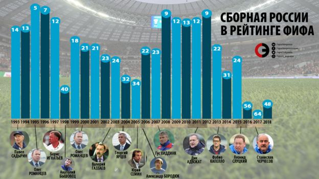 В сравнении с прошлым годом, команда Станислава Черчесова, вышедшая в 1/4 финала на домашнем чемпионате мира, поднялась на 16 мест.