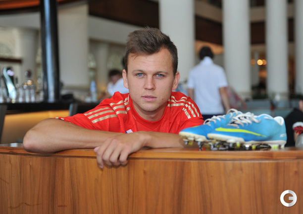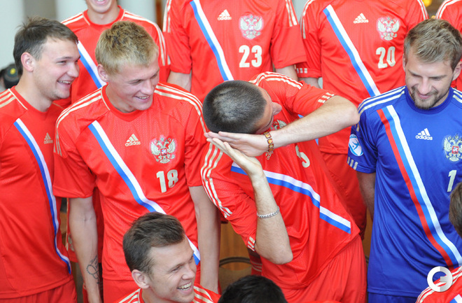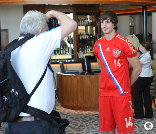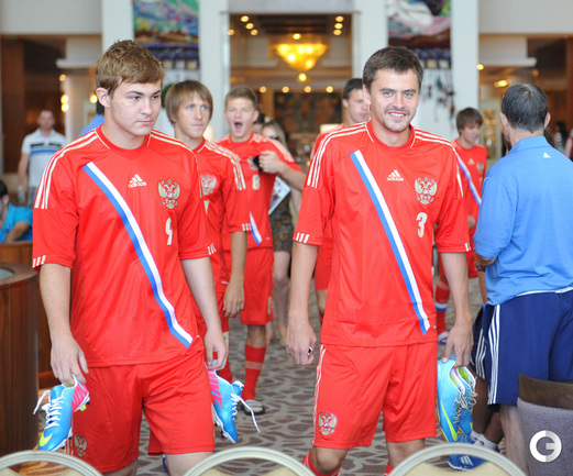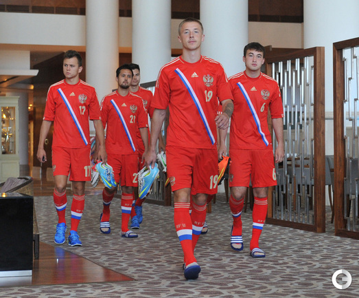 Футболисты молодежной сборной России сфотографировались для официального буклета УЕФА накануне старта европейского первенства в Израиле. Фото - Татьяна Дорогутина, "СЭ"