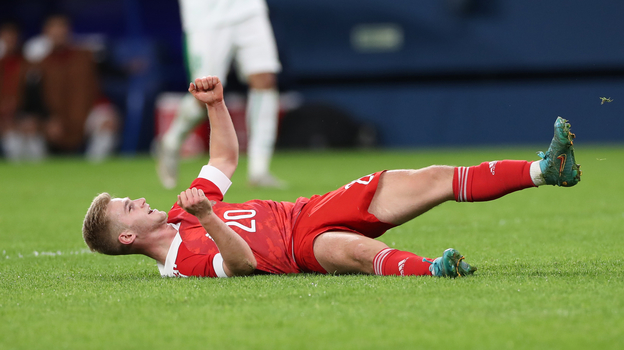 Россияне открыли счет на 50-й минуте — отличился Антон Миранчук, а через восемь минут второй мяч провел Сергей Пиняев.