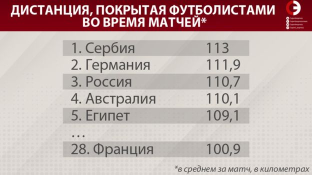 Из пятерки самых бегающих команд лишь одна вышла в плей-офф. И это Россия. А Франция – в самом конце списка (только Аргентина, Нигерия, Мексика и Панама преодолели меньшую дистанцию). Французы действительно прессинговали невысоко и явно экономили силы по ходу матчей.