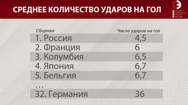 Россию ставят в пример и в отчете. И правильно, ведь команда Станислава Черчесова оказалась лучшей во всем, что касается реализации. Мы – первые по среднему числу ударов в створ на гол (1,6), из штрафной на гол (3,7) и из-за штрафной на гол (8,0). Франция тоже везде в пятерке, так что уместно сделать наставление на будущее: относитесь к опасным моментам бережнее, а не как Германия (гол каждые 36 ударов).