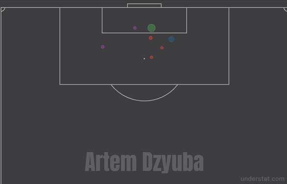 Старт этого сезона получился для Дзюбы неудачным. Дело даже не в статистике: 1 гол и 1 результативный пас в первых шести турах. А в том, как Дзюба выглядит на поле. Артем — тяжеловат, будто бы находится под нагрузками, свойственными сборам. Он по-прежнему круто работает корпусом (выиграть силовое единоборство у него практически невозможно), но зачастую оказывается не там, где был бы наиболее полезен. Скорость ли это? Задания Семака? Но вот не самый приятный для Дзюбы факт: он нанес всего лишь 6 ударов в 6 турах — все из пределов штрафной площади.