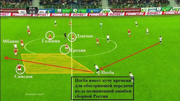 За три дня ничего не изменилось. Команда Станислава Черчесова все так же уязвима и порой сама не замечает, как собирается толпой на маленьком участке. Показателем в этом плане первый мяч Кильяна Мбаппе. Главная критика досталась центральным защитникам, однако их недоработки стали лишь следствием первоначальной ошибки. Ключевым моментом результативной атаки стал пас Юмтити на Погба, в момент которого все три хавбека сборной России расположились в центральном круге и никак не участвовали в эпизоде. Самедов теоретически мог подняться выше, но ему пришлось держать в уме подключение крайнего защитника французов.