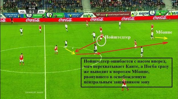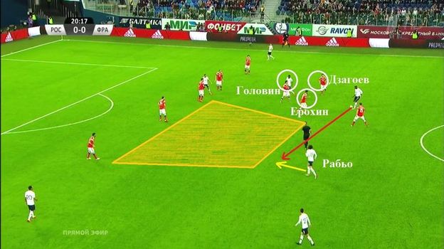 Заканчивалось это сплошными неприятностями: из-за несогласованности с выходом задерживался либо один из центральных защитников, либо крайний. На 11-й минуте подвел Кудряшов. От выхода один на один россиян спасла неудачная обработка мяча Мбаппе.