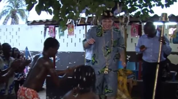 Саенко устроили по-настоящему африканский прием. Сначала исполнили традиционные народные танцы, потом поднесли угощения. А затем короновали, ведь футболист стал главным кормильцем академии. Некий шаман, или, возможно, просто глава местной общины, произнес несколько слов, трижды пролил воду из стакана на землю, после чего на Саенко надели огромную желтую мантию, корону и большое кольцо.