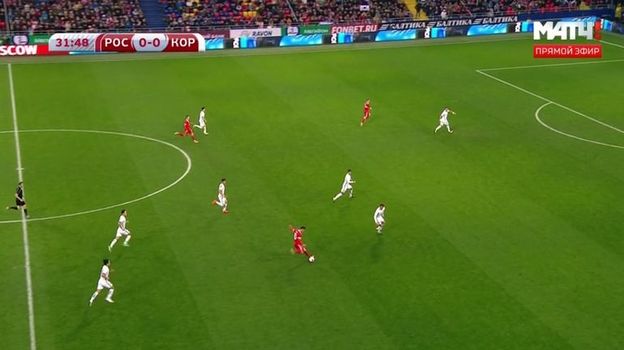 И таких примеров было еще несколько. Действительно же опасный момент связка сообразила лишь однажды за весь матч (имеется ввиду именно совместными усилиями): на 29-й минуте Смолов подкараулил неудачный ввод мяча корейцами от ворот, отобрал мяч у защитника и выкатил идеальную передачу в центр штрафной Кокорину. Тот промазал. Атака вышла ситуативной, но похвалить Федора нужно обязательно. Он вообще в этом матче просто здорово работал без мяча, включаясь в эпизоды при малейшей возможности отбора.
