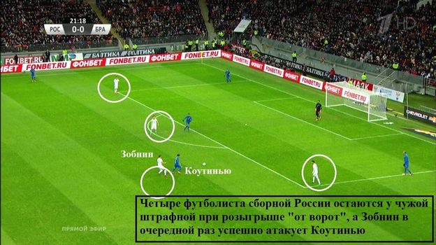 Этот недуг проявляется не только у представителей обороны, но и у остальных. В средней линии он приводит к чрезмерному смещению к одному из флангов и оголенному пространству на противоположном. А непосредственно в штрафной заканчивается такими неловкими ситуациями, как при третьем голе: четыре человека сторожат ближнюю штангу и пытаются прервать навес Виллиана, а на дальнем углу вратарской находится свободный Паулинью. Смолов мог бы быть рядом с ним, но он также оказался занят просмотром футбола.
