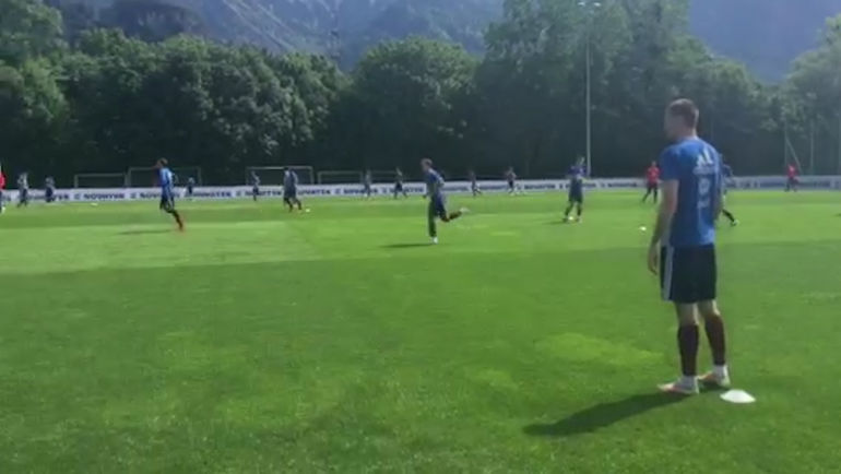 Сборная России перед очередной тренировкой в рамках подготовки к чемпионату Европы-2016 аплодисментами поздравила вратаря Юрия Лодыгина с 26-летием.