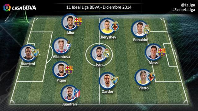 Полностью символическая сборная минувшего тура примеры выглядит так: Идрисс Камени – Жорди Альба, Рауль Альбентоса, Жерар Пике, Хуанфран – Денис Черышев, Иско, Серхи Дардер – Криштиану Роналду, Лионель Месси, Лусиано Вьетто.