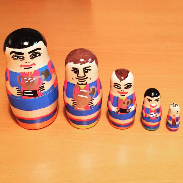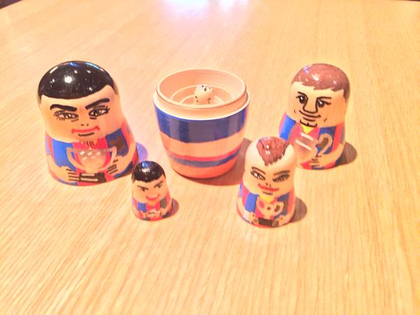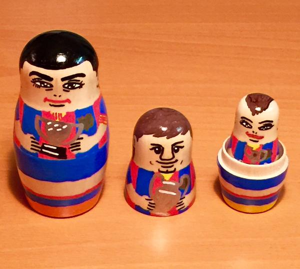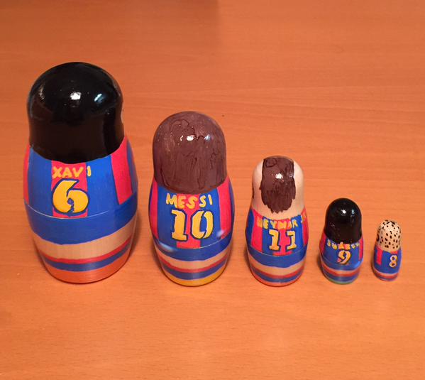 Игроков "Барселоны" изобразили в виде матрешек, сообщает твиттер barcastuff. Подобный чести удостоились нападающие Лионель Месси, Неймар, Луис Суарес, а также полузащитник Хави.