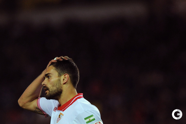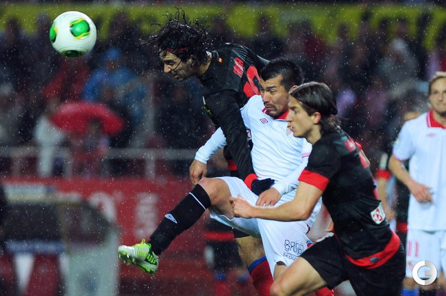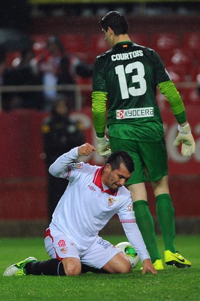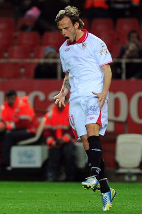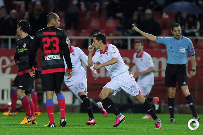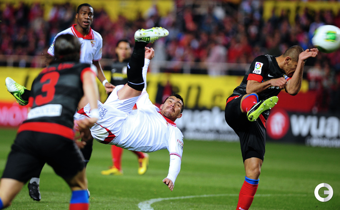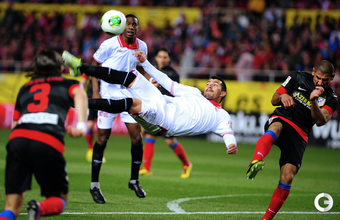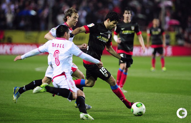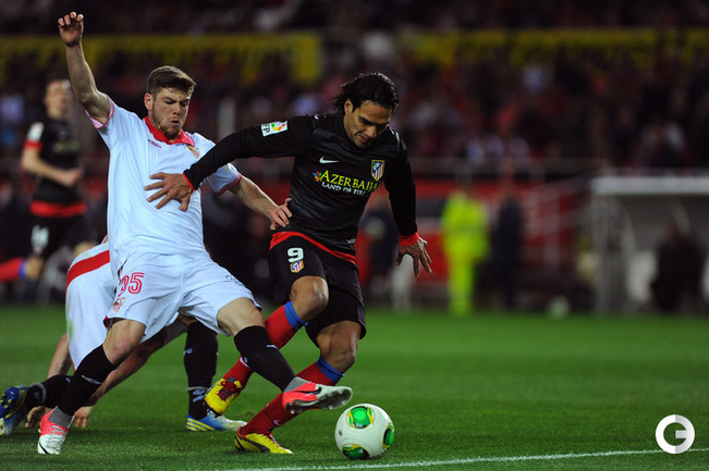 Футбол. Кубок Испании. 1/2 финала. Ответный матч. "Севилья" – "Атлетико" – 2:2 (1:2). Голы: Диегу Коста, 6 (0:1). Фалькао, 29 (0:2). Навас, 39 (1:2). Ракитич, 90+1 (2:2). Удаления: Медель (С), 76. Кондогбиа (С), 90+3. Первый матч – 1:2. Этот результат вывел в финал мадридцев, где они встретятся с "Реалом". Фото AFP