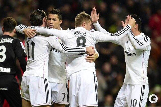 Чемпионат Испании. Примера. "Реал" - "Райо Вальекано" - 5:1 (2:1). Голы: Бэйл, 9 (1:0). Серхио Рамос, 40 (2:0). Буэно, 44 (2:1). Кроос, 55 (3:1). Бензема, 59 (4:1). Криштиану Роналду, 83 (5:1). Фото AFP, REUTERS