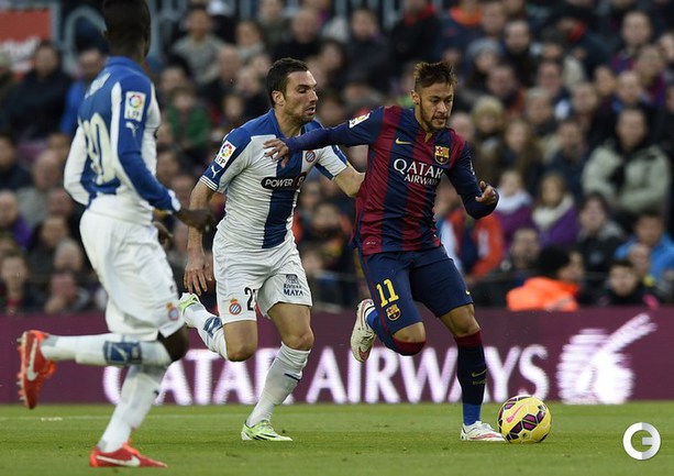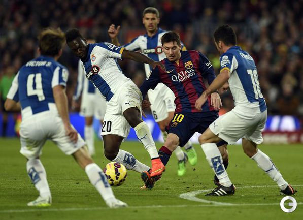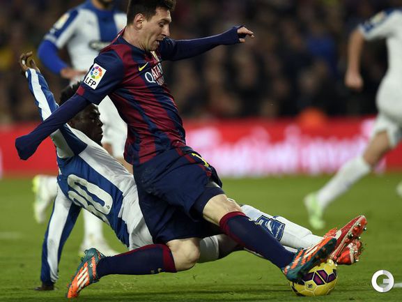 Чемпионат Испании. Примера. 14-й тур. "Барселона" - "Эспаньол" - 5:1 (1:1). Голы: Серхио Гарсиа, 13 (0:1). Месси, 45 (1:1). Месси, 50 (2:1). Пике, 53 (3:1). Педро, 77 (4:1). Месси, 81 (5:1). Форвард "Барсы" Лионель Месси установил новый рекорд примеры по количеству голов – забив 3 мяча в игре 12-го тура с "Севильей" (5:1), аргентинец на 2 гола улучшил достижение Тельмо Сарры, 251 раз поражавшего ворота соперников. Таким образом, после сегодняшнего хет-трика Месси бомбардирский рекорд чемпионата Испании составляет 256 голов. Фото AFP