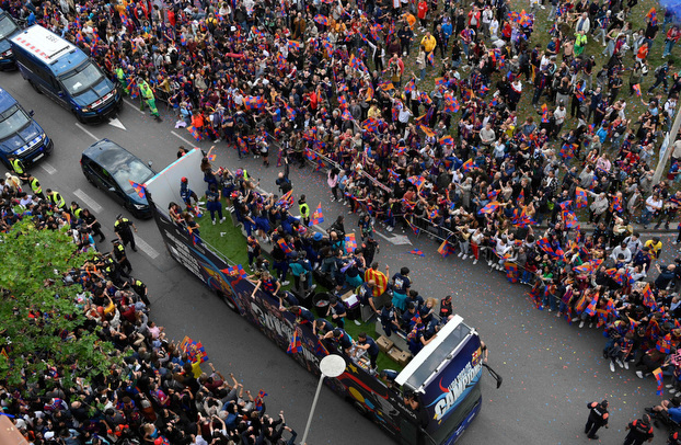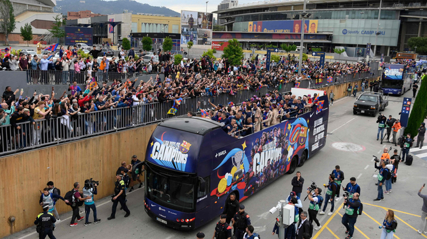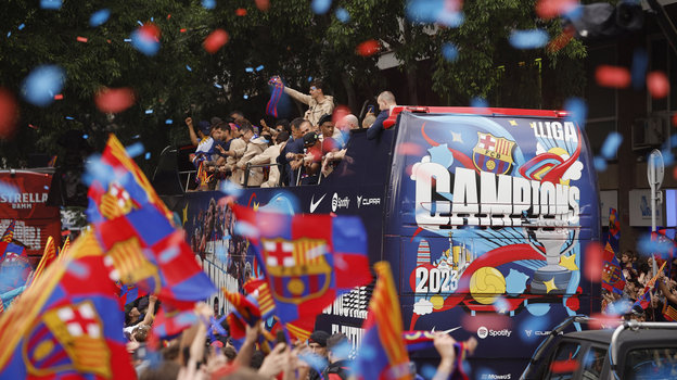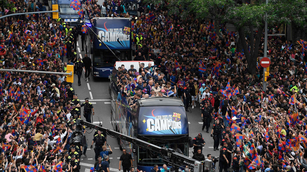Игроки и тренеры «Барселоны» после 27-й победы в чемпионате Испании проехались по городу в праздничном кортеже от стадиона «Камп Ноу» до Триумфальной арки.