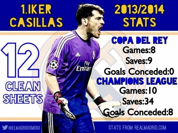 Голкипер "Королевского клуба" Икер Касильяс выиграл 8 из 11 финалов, в которых принимал участие, не пропустив ни одного решающего поединка с 14 лет. В нынешнем розыгрыше Кубка Испании вратарь не потерпел ни одного поражения и не пропустил ни одного мяча.