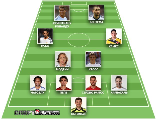Анчелотти уже успел приучить болельщиков к постоянному использованию тактической схемы 4-4-2, в которой напарниками Роналду по атаке становились то Бензема, то Эрнандес, то Бэйл. Валлиец не сможет сыграть в класико из-за травмы, так что если тренер обойдется без сюрпризов, то полузащита и атака должны остаться такими же, как на "Энфилде", – Бензема и Криштиану на острие, Хамес справа, Иско слева, Кроос с Модричем в опорной зоне. Варану придется уйти в запас из-за возвращения Серхио Рамоса, а вместо Арбелоа, как ожидается, сыграет Карвахаль из-за плановой ротации состава.