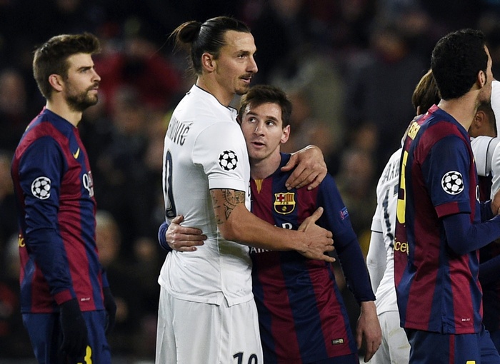 Среда. Барселона. "Барселона" - "ПСЖ" - 3:1. Лионель МЕССИ и лидер парижан Златан ИБРАГИМОВИЧ (в центре). Фото AFP