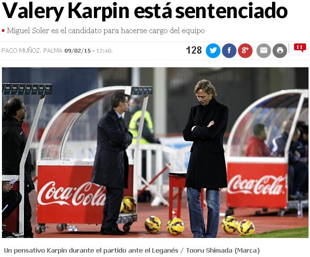 Еще с утра испанские СМИ называли уход Карпина предрешенным - так, статья в газете Marca называлась "Карпин приговорен". Немудрено, ведь после 24 туров красно-черные занимают 15-е место из 22 команд второй испанской лиги. У "Мальорки" 7 побед, 6 ничьих и 11 поражений при разнице мячей 30-37. По количеству пропущенных голов входит в число четырех худших клубов турнира.