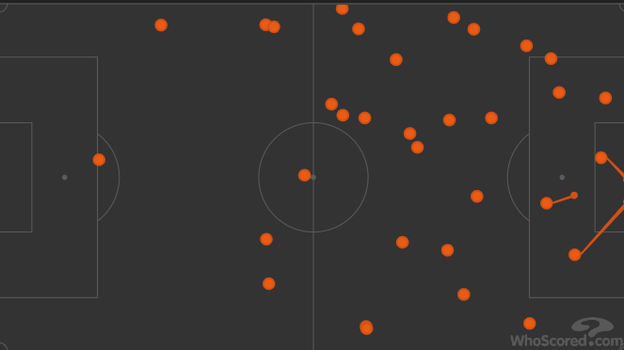 Кроме того, Федор по-прежнему расположен к работе в подыгрыше: он сваливается на оба фланга, пытаясь комбинировать с партнерами (сам обыгрывает редко — одна попытка дриблинга в игре с «Алавесом»). Можно сказать, что именно Смолов отдал предголевой пас на Нолито, когда забивал Мина. Вот карта его касаний в этом матче, на которой виден большой объем работы вне штрафной площади.