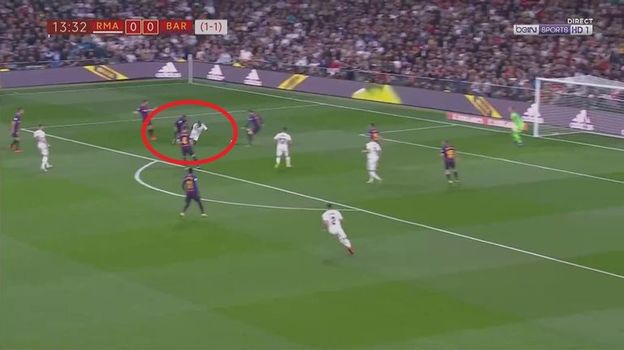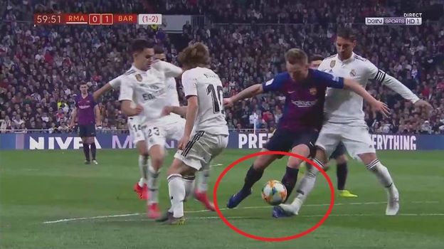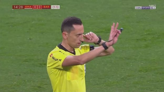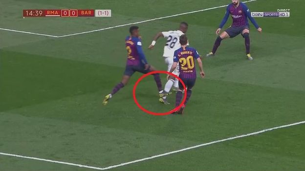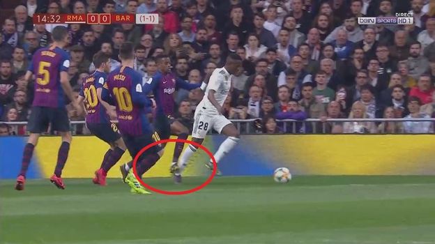 Первый эпизод произошел на 14-й минуте в штрафной площади каталонцев, где Нелсон Семеду совершил фол по неосторожности – произошел контакт его ноги с правой ногой Винисиуса Жуниора. Санчес Мартинес матч не остановил и только примерно через минуту, когда мадридцы сфолили на своей половине поля, попросил не вводить мяч в игру и поговорил с видеоарбитром (ВАР) Рикардо Де Бургосом Бенгоэчеа.