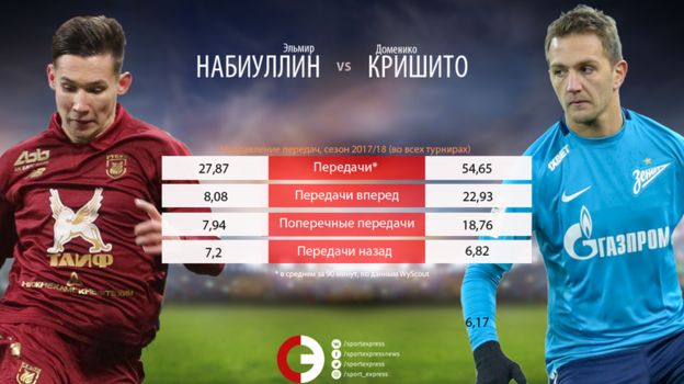 Вовлеченность Набиуллина в игру "Рубина" не такая значительная, как у Кришито в "Зените". Достаточно посмотреть, сколько передач он отдавал назад и поперек в этом сезоне, и каков был вектор пасов у Кришито. У Эльмира с передачами не все так благополучно, как у итальянца. Точность пасов вперед у защитника "Рубина" – всего 55%, тогда как у Доменико – 71,45.