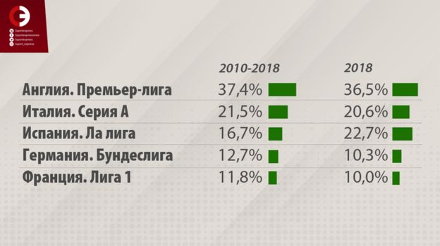 В 2018 году трансферные расходы увеличились в двух турнирах: чемпионате Англии (+2,1 %) и ла лиге (+80,4%). Огромный поток денег из Испании обусловлен как грамотным распределением телевизионных прав, позволяющих получать прибыль от трансляций по всему миру, так и успехом команд из Примеры на международной арене: в сезоне-2018/19 Лигу чемпионов в третий раз подряд выиграл "Реал", победителем Лиги Европы стал "Атлетико".