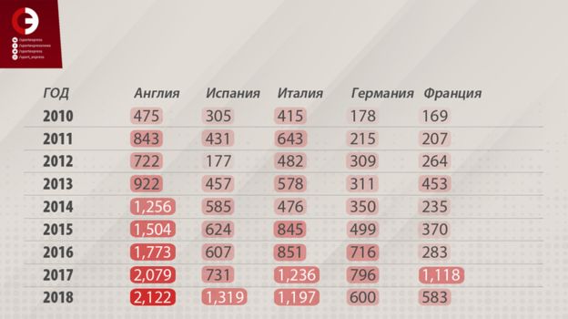 Главными транжирами европейского футбола являются клубы, представляющие английскую премьер-лигу. Трансферные затраты представителей чемпионата Англии составили 37,4 % от общего количества средств, потраченных на покупку футболистов в ведущих европейских лигах. С 2010 года клубы из АПЛ потратили в 1,6 раз больше денег по сравнению с коллегами из серии А, в 2,1 раза – из ла лиги, в 2,8 раз – из бундеслиги, в 3,1 раз – из лиги 1.