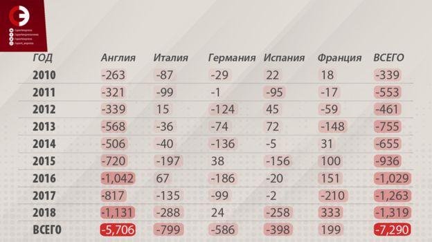 Если взглянуть на трансферные балансы клубов, представляющих ведущие европейские чемпионаты, то можно увидеть, что здесь царит тотальный дефицит. Он составил 7,29 миллиарда евро в период с 2010 по 2018 год. Ответственной за эту плачевную картину является английская премьер-лига – ее доля в совокупном дефиците составляет 78,3 %.