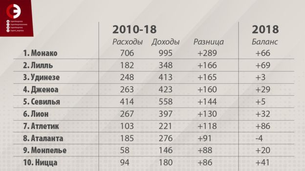 Рейтинг команд, имеющих профицит трансферного баланса, возглавляет "Монако". За последние 8 лет этот показатель составил +289 миллиона евро, в 2018 году – плюс 66 миллиона евро. В первой десятке данного списка находятся сразу пять команд из чемпионата Франции, три – из серии А, две – из ла лиги. Примечательно, что ни один английский клуб в этот рейтинг не попал.