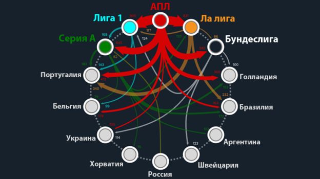 Опубликованные финансовые данные подтверждают очевидное: клубы из пяти ведущих европейских чемпионатов тратят огромные суммы на трансферы и зарплаты, чтобы привлечь и впоследствии удержать наиболее талантливых игроков со всего мира. Ключевую роль на этом рынке играет АПЛ: с 2010 по 2018 год денежные потоки из премьер-лиги поступали по шести основным направлениям: 905 миллионов евро во Францию, 831 миллион – в Испанию, 645 миллионов – в Италию, 582 миллиона – в Германию, 412 миллионов – в Португалию, 369 миллионов – в Нидерланды.