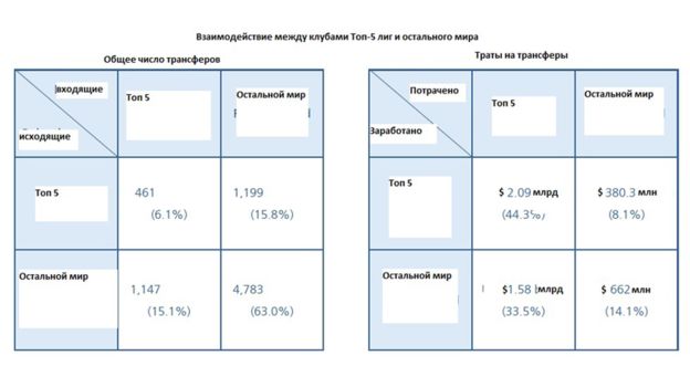 Как вы думаете, как много сделок провернули 98 клубов элитных лиг Англии, Италии, Испании, Германии и Франции между собой? Всего – 461. Число солидное, но на фоне всей Земли незначительное – лишь 6,1 процента от общего числа трансферов. Зато при пересчете на деньги эта доля увеличивается аж в семь раз.