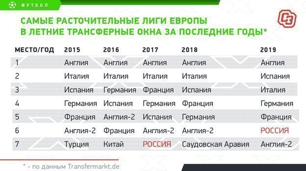 Господство англичан настолько велико, что даже чемпионшип регулярно оказывается в шестерке самых расточительных лиг. Правда, в этом сезоне удивительная энергичность российских клубов не позволила второму по силе дивизиону Англии занять привычное шестое место. А для РПЛ это настоящий прорыв: последний раз Россия так высоко закончила финансовое лето в 2013 году — тогда наши клубы вскладчину потратили 283 миллиона евро и даже обошли бундеслигу. С тех пор мы последовательно занимали 8-е, 20-е, 9-е, 7-е и 12-е места. Лето-2015 выдалось особо тяжелым: РПЛ на фоне обвала курса рубля раскошелилась лишь на 19 миллионов евро и проиграла даже Швейцарии, Греции и Аргентине.