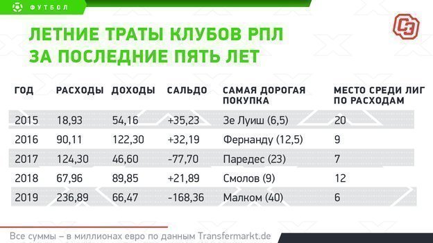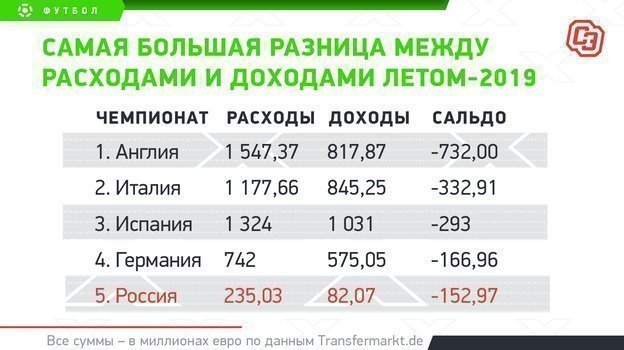 России в этом рейтинге и близко нет. Она на другом конце — пятая сверху по величине отрицательного сальдо. 152,97 миллиона евро — такова разница между расходами и доходами у РПЛ в этом году. Крупнее минус только у англичан, итальянцев, испанцев и немцев. Мы много потратили в эти три месяца, осталось понять — аномалия это или начало тенденции.