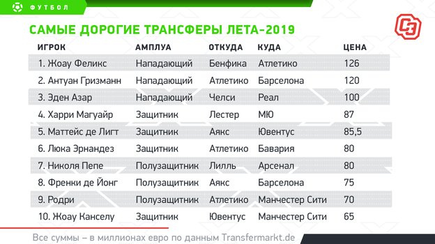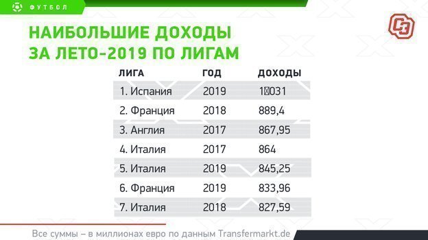 А у Испании доход составил больше миллиарда евро. Тут считаются еще и внутренние трансферы, так что переход Гризманна из «Атлетико» в «Барсу» входит в эту сумму. Раньше такого не было: наибольший доход за лето показывала Франция год назад — 889,4 миллиона евро. Испания же первой преодолела миллиард. Занятно, что при этом сальдо у пиренейской элиты все равно отрицательное, потому что на покупки она потратила больше 1,3 миллиарда.