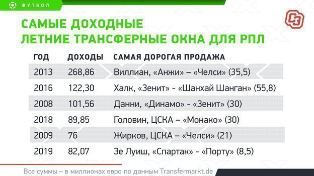 Наша лига никогда не была донорской, в отличие от португальской или голландской. Даже прошлым летом на фоне удачного чемпионата мира российские клубы заработали на продажах всего 90 миллионов евро. Минувшее трансферное окно — среднее по выручке для нашей лиги. Крупнейшая продажа — Зе Луиш из «Спартака» в «Порту» за 8,5 миллиона евро, нормальная цена для топ-футболиста чемпионата России. По доходам РПЛ заняла 18-е место в это окно — больше заработали Австрия, Турция и все вторые дивизионы топ-чемпионатов.