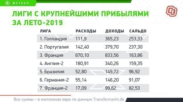 Ни для кого не секрет, что в Португалии и Голландии умеют зарабатывать деньги. Ежегодно тамошние клубы выручают от продаж больше, чем тратят. Этот сезон — не исключение. В прошлом году самое большое положительное сальдо было у Франции и Бразилии, Португалия была третьей, а Голландия аж 18-й — непродуктивный был сезон. Этим летом мы видим более привычную картину. Как и в 2017 году, португальские и голландские клубы получили наибольшие прибыли.