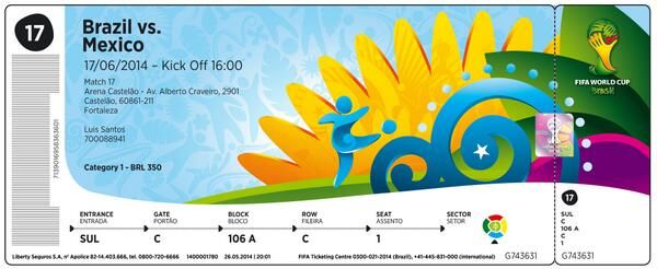 Генеральный секретарь ФИФА Жером Вальке в своем твиттере представил первое изображение официального билета на матчи чемпионата мира-2014. Уже через 6 часов первые из них будут отправлены своим обладателям. Напомним, все билеты на чемпионат мира-2014 уже проданы.