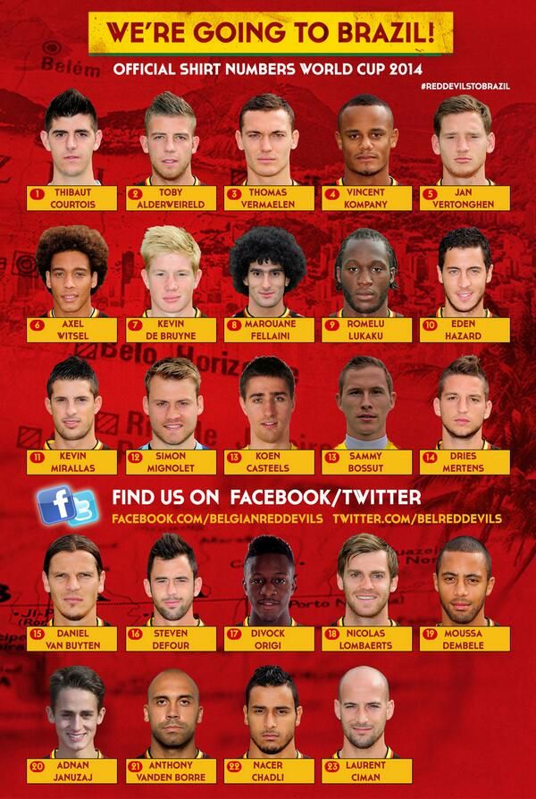 Приводим полную заявку сборной Бельгии на мировое первенство в Бразилии: 1. Тибо Куртуа ("Атлетико", Испания), 2. Тоби Алдервейрелд ("Атлетико"), 3. Томас Вермален ("Арсенал", Англия), 4. Венсан Компани ("Манчестер Сити", Англия), 5. Ян Фертонген ("Тоттенхэм", Англия), 6. Аксель Витсель ("ЗЕНИТ", Россия), 7. Кевин де Брюйне ("Вольфсбург", Германия), 8. Маруан Феллаини ("Манчестер Юнайтед", Англия), 9. Ромелу Лукаку ("Эвертон", Англия), 10. Эден Азар ("Челси", Англия), 11. Кевин Миральяс ("Эвертон", Англия), 12. Симон Миньоле ("Ливерпуль", Англия), 13. Кун Кастелс ("Хоффенхайм", Германия) / Самми Боссют ("Зюлте-Варегем"), 14. Дрис Мертенс ("Наполи", Италия), 15. Даниэль ван Бюйтен ("Бавария", Германия), 16. Стивен Дефур ("Порту", Португалия), 17. Дивок Ориги ("Лилль", Франция), 18. Николас Ломбертс ("ЗЕНИТ", Россия), 19. Мусса Дембеле ("Тоттенхэм", Англия), 20. Аднан Янузай ("Манчестер Юнайтед"), 21. Антони Ванден Борре ("Андерлехт"), 22. Насер Шадли ("Тоттенхэм", Англия), 23. Лоран Симан ("Стандард").