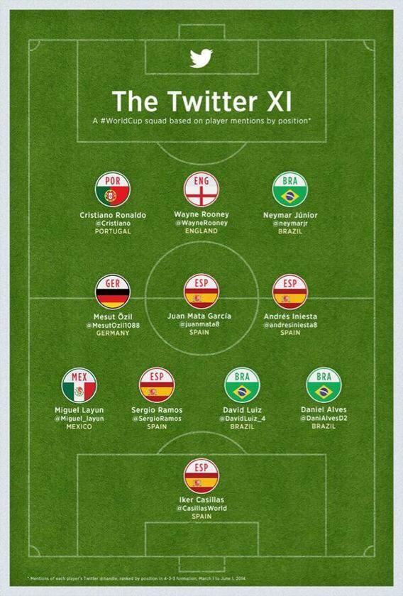Опубликована символическая сборная чемпионата мира-2014, основанная на частоте упоминания футболистов в твиттере за последний год. Стоит отметить непопадание в команду, сформированную на основе схемы 4-3-3, одного из самых популярных футболистов мира Лионеля Месси. Также примечательно, что на левом фланге обороны обосновался мексиканец Мигель Лайюн из "Америки". Полностью сборная выглядит следующим образом: