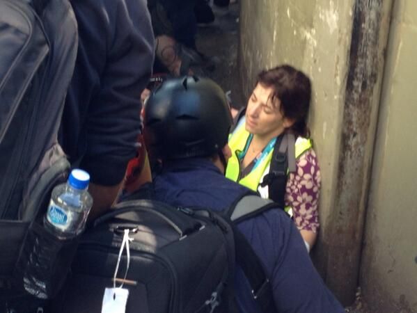 Две сотрудницы бразильского бюро CNN пострадали в результате столкновений граждан с полицией за несколько часов до матча открытия чемпионата мира-2014. Глава корреспондентского бюро Шаста Дарлингтон (на фото) и продюсер Барбара Арванитидис получили ранения после того, как правоохранительные органы применили спецсредства для разгона толпы. Фото взято из твиттера @Soccerpolitics, было изначально размещено в твиттере журналиста Бена Тавернера, но, по всей видимости, впоследствии удалено.