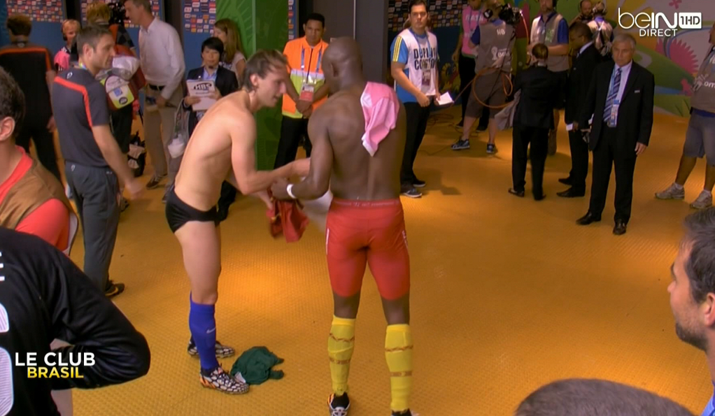 Одним из самых популярных футболистов сборной Хорватии после матча чемпионата мира-2014 с Камеруном (0:4) стал, судя по всему, полузащитник Иван Ракитич. Экс-партнер хавбека по "Севилье" Стефан М'Биа предложил Ракитичу обменяться формой и раздел его в прямом смысле до трусов. Новичок "Барселоны" отдал всю свою форму своему бывшему партнеру, оставив себе лишь бутсы и гетры.