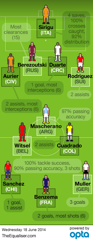 Полностью состав выглядит следующим образом: Сиригу (Италия), Орье (Кот-д’Ивуар), Березуцкий (РОССИЯ), Дуарте (Коста-Рика), Родригес (Швейцария), Витсель (Бельгия), Маскерано (Аргентина), Куадрадо (Колумбия), Санчес (Чили), Бензема (Франция), Мюллер (Германия).