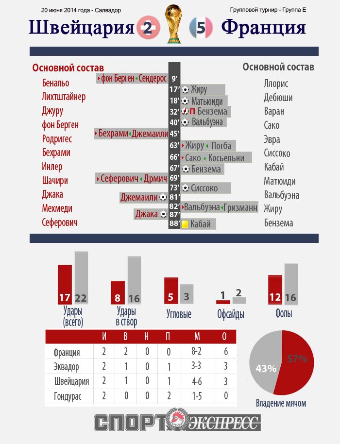 "СЭ" предлагает вашему вниманию статистику матча чемпионата мира-2014 в Бразилии Швейцария – Франция (2:5). Героем встречи стал нападающий "трехцветных" Карим Бензема. Он нанес 8 ударов по воротам, один из которых стал голам. Также форвард отдал две голевые передачи и создал шесть голевых моментов.