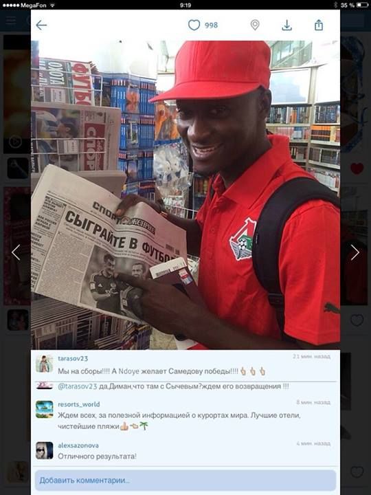 Нападающий "Локомотива" Даме Ндой пожелал удачи сборной России перед матчем группового турнира чемпионата мира-2014 с Алжиром. Об этом на своей странице в одной из социальных сетей написал другой железнодорожник Дмитрий Тарасов. Ндой, держа в руках газету "СЭ", показал пальцем на своего партнера по "Локо" Александра Самедова, который защищает цвета национальной команды.
