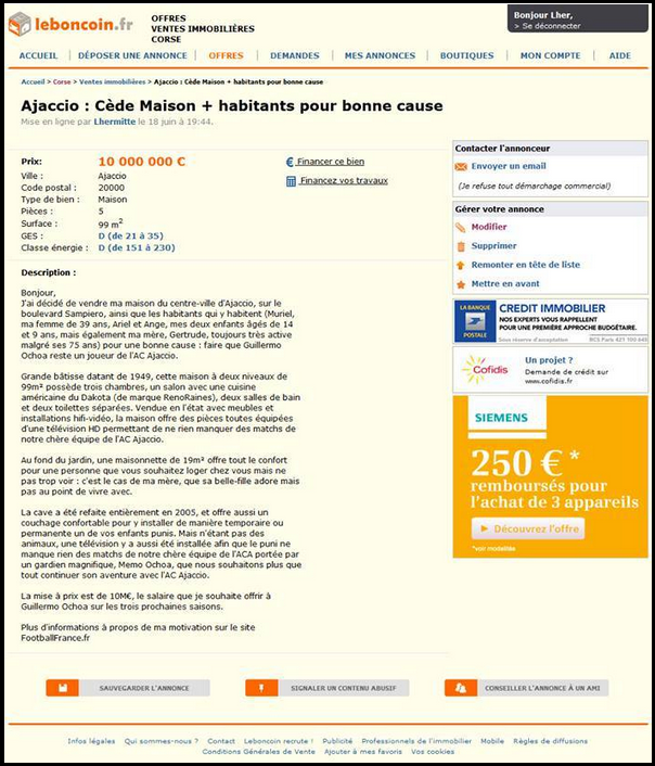 Болельщик "Аяччо", встревоженный уходом из команды вратаря сборной Мексики Гильермо Очоа, выставил на продажу свой дом. На одном из интернет-аукционов фанат разместил объявление, в котором обозначил цену – 10 миллионов евро. В качестве бонуса болельщик предлагает… свою 39-летнюю жену и двоих детей возрастом 9 и 14 лет.