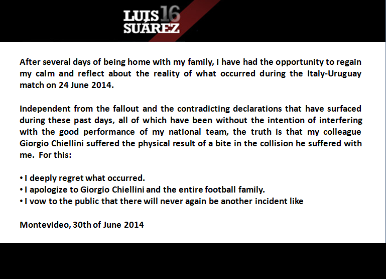 После нескольких дней, проведенных дома со своей семьей, я хочу выразить сожаление о случившемся в матче Италия – Уругвай.
