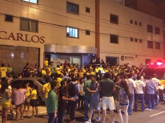 Болельщики сборной Бразилии приехали к госпиталю Фортвлезы, чтобы поддержать нападающего Неймара, получившего травму позвоночника в матче 1/4 финала чемпионата мира-2014 против Колумбии (2:1), сообщает O Globo. Поклонники национальной команды собрались у входа в больницу. Напомним, что форвард получил травму третьего поясничного позвонка и пропустит остаток мирового первенства. По прогнозам врача команды, Неймару не потребуется операция, но восстановление займет определенное время.