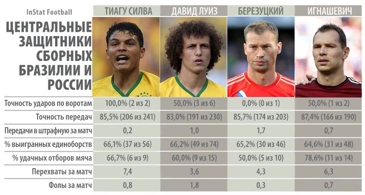 "СЭ" и InStat Football на основании показателей сборных России и Бразилии на ЧМ-2014 сравнили пары центральных защитников двух команд – Василия Березуцкого и Сергея Игнашевича, Тиагу Силву и Давида Луиза.