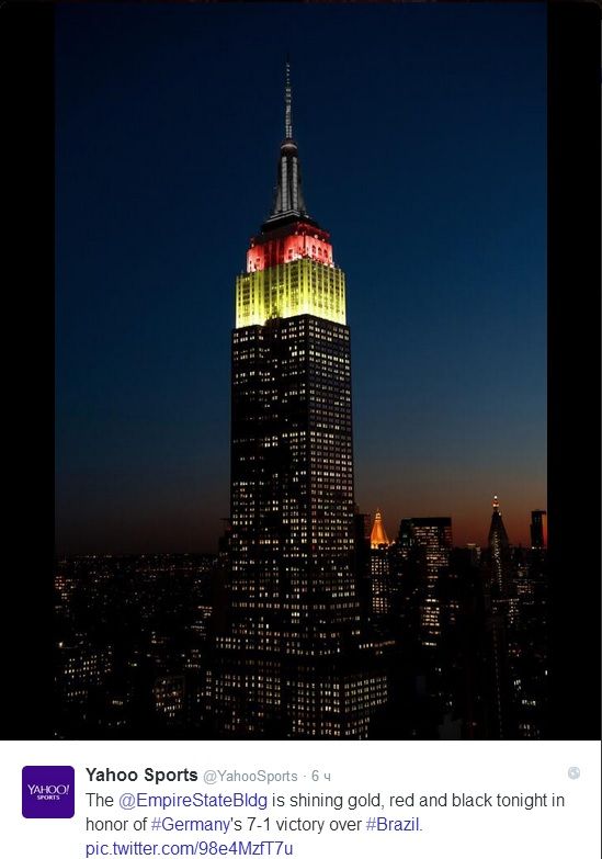 В честь победы сборной Германии над Бразилией (7:1) в матче 1/2 финала чемпионата мира знаменитый небоскреб "Эмпайр Стэйт Билдинг" в Нью-Йорке был подсвечен в цветах немецкого флага, сообщает твиттер Yahoo! Sports. Второе по высоте здание в городе окрасилось в черный, красный и желтый цвета. Отметим, что здание, построенное более 80 лет назад, регулярно подсвечивается разноцветной иллюминацией в честь различных событий.