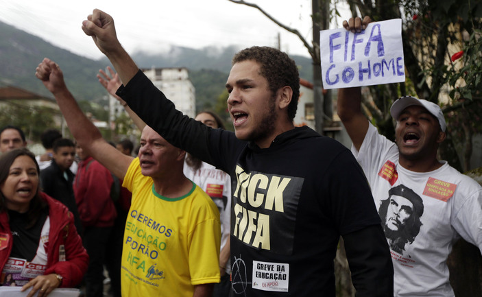 Главный футбольный трофей заканчивает свой мировой тур. В Сан-Пауло его увидели индейцы, а легендарный Ривелино расцеловал своими знаменитыми усами. Сборная Бразилии продолжает подготовку к домашнему чемпионату. Автобус с игроками встречают протестами манифестанты, которые возмущены затратами на проведение мирового форума. Фото REUTERS и AFP